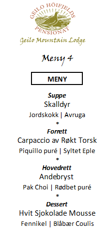 Middagen er et av høydepunktene under et opphold på Geilo Mountain Lodge. Hver kveld serverer vi en sesongbasert 4-retters smaksmeny inspirert av råvarer fra fjell, skog og fjord – som vilt, fisk, bær og urter fra Hallingdal og Hardangervidda. Middagen serveres i restauranten på Geilo Mountain Lodge, en liten og intim restaurant på Geilo kjent for sin 4-retters fjellgourmet.